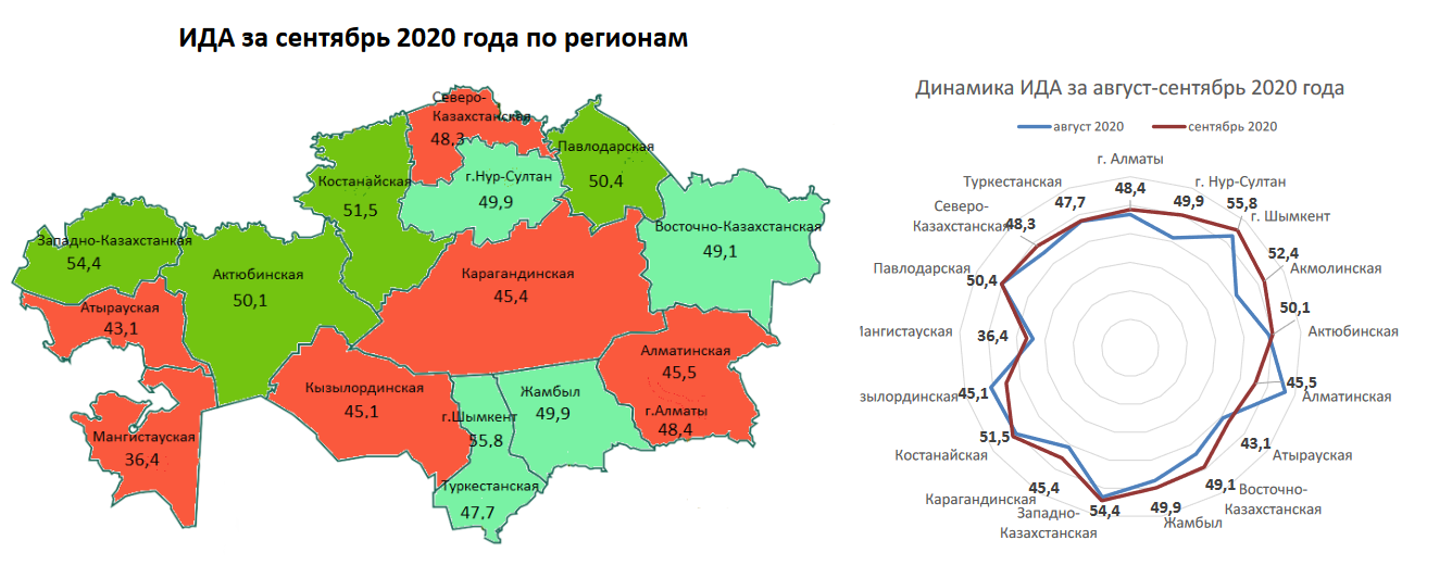 То есть с точки зрения бизнеса здесь наблюдаются позитивные изменения. Но похвастать этим могут не все. За месяц индекс значительно понизился в Алматинской области (на 10,9 пункта) и Кызылординской (на 5,7 пункта — до 45,1). В Мангыстауской области, несмотря на небольшой рост, ИДА остается крайне низким (36,4 пункта).