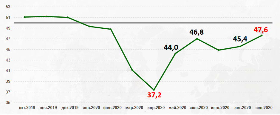 Показатель сентября – 47,6 пунктов. Это лучший результат с марта текущего года. То есть можно говорить о постепенном восстановлении экономики.