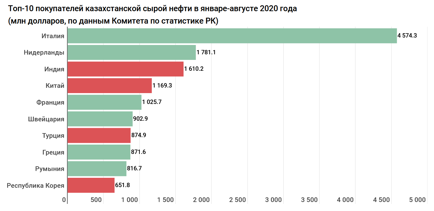 По итогам 8 месяцев ключевым покупателем остается Италия – экспорт нефти в эту страну принес 4 млрд 574,3 млн долларов. Это 26,7% от общей выручки за «черное золото». На второе место вышли Нидерланды – около $1,8 млрд.