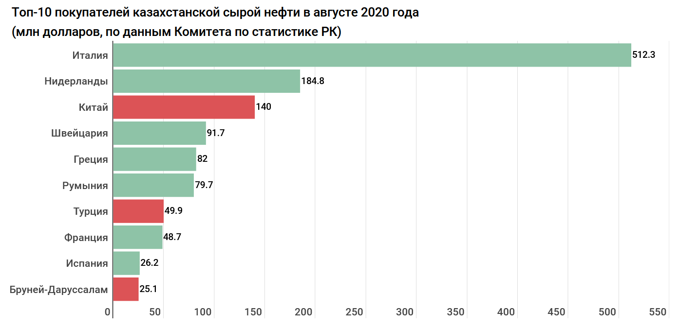 Августовский рост экспорта нефти связан в первую очередь с увеличением продаж в европейском направлении. Сильнее всего по сравнению с июлем увеличились объемы сделок с Италией, которая остается ключевым покупателем отечественной нефти. 512,3 против 154 млн долларов месяцем ранее. Ощутимый прирост наблюдается еще по ряду стран: