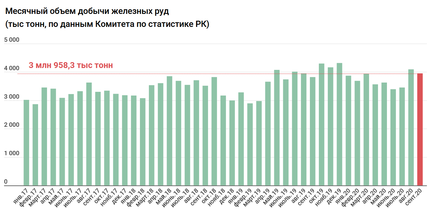 По данным Комитета по статистике, индекс промышленного производства (ИПП) в январе-сентябре 2020 составил 100% по отношению к 2019. При этом по итогам 8 месяцев он был несколько выше – 100,4%. Но в первый осенний месяц текущего года производство оказалось на 3,5% ниже, чем в сентябре прошлого года. В итоге это уравновесило показатели двух лет.