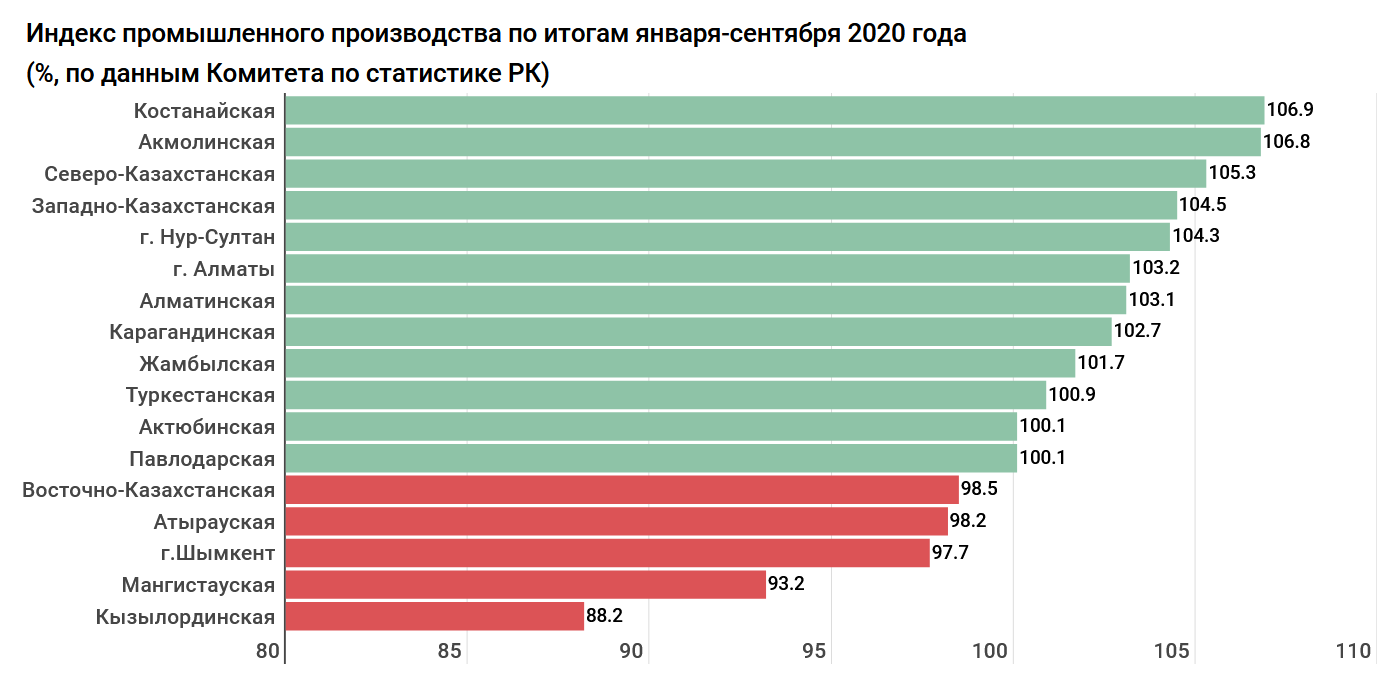 Основное снижение в сентябре связано с Атырауской областью. Здесь годовой индекс промышленного производства упал на 21,4%. По итогам 9 месяцев – на 1,8%.