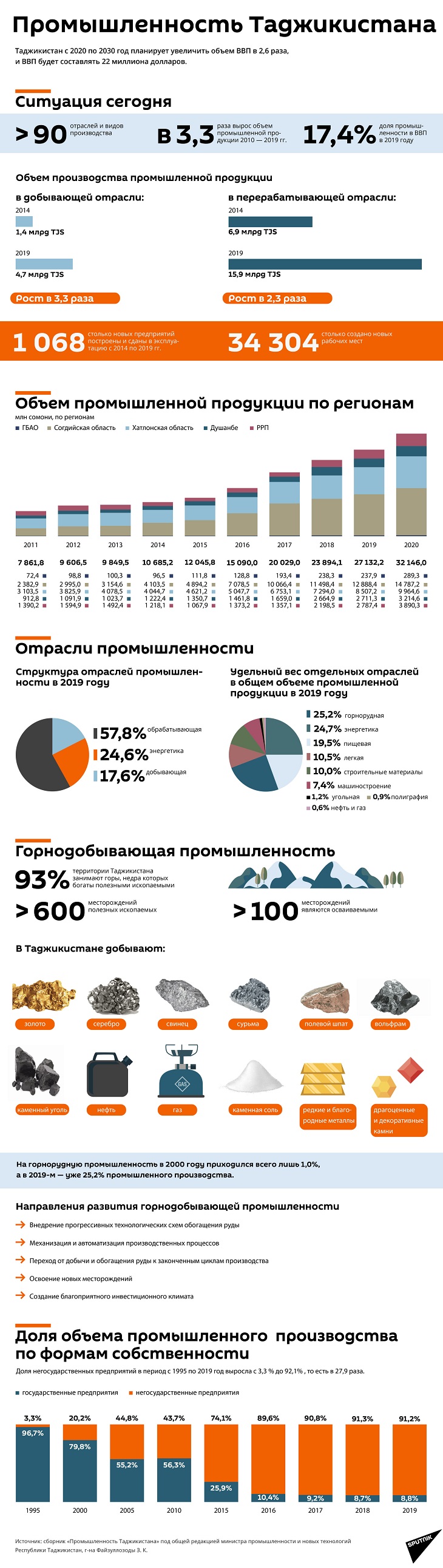 Также стоит отметить, что в период независимости Таджикистана доля негосударственных предприятий в промышленности выросла с 3 процентов до 91.