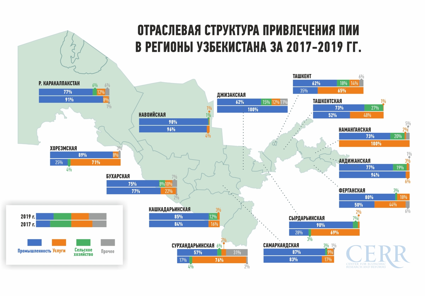 Последние несколько лет, отраслевая структура освоения ПИИ регионами значительно диверсифицировалась В отраслевой структуре ПИИ в разрезе регионов за 2017-2019 гг. значительный переток ПИИ в секторы промышленности, по сравнению с другими отраслями, отмечен в Наманганской (с 0% в 2017 году до 73% в 2019 году), Сурхандарьинской (с 17% в 2017 году до 57% в 2019 году), Сырдарьинской (с 28% в 2017 году до 90% в 2019 году), Хорезмской (с 25% в 2017 году до 89% в 2019 году), Ферганской (с 50% в 2017 году до 80% в 2019 году) областях и г. Ташкенте (с 35% в 2017 году до 62% в 2019 году).