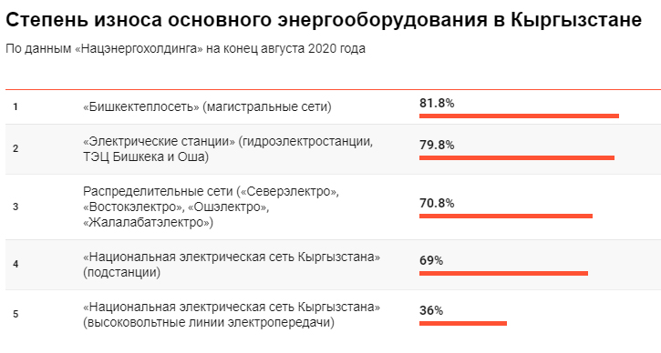 По данным финансового издания Economist.kg, на август 2020 года износ оборудования электрических сетей в Кыргызстане составляет более 70%. Средний технический уровень по многим параметрам соответствует оборудованию, которое эксплуатировалось в развитых странах мира 25-30 лет назад. Большая его часть проработала свыше 30 лет и имеет значительный износ, превышающий нормативный срок. На обновление и ввод новых мощностей требуется примерно $4,3 млрд.
