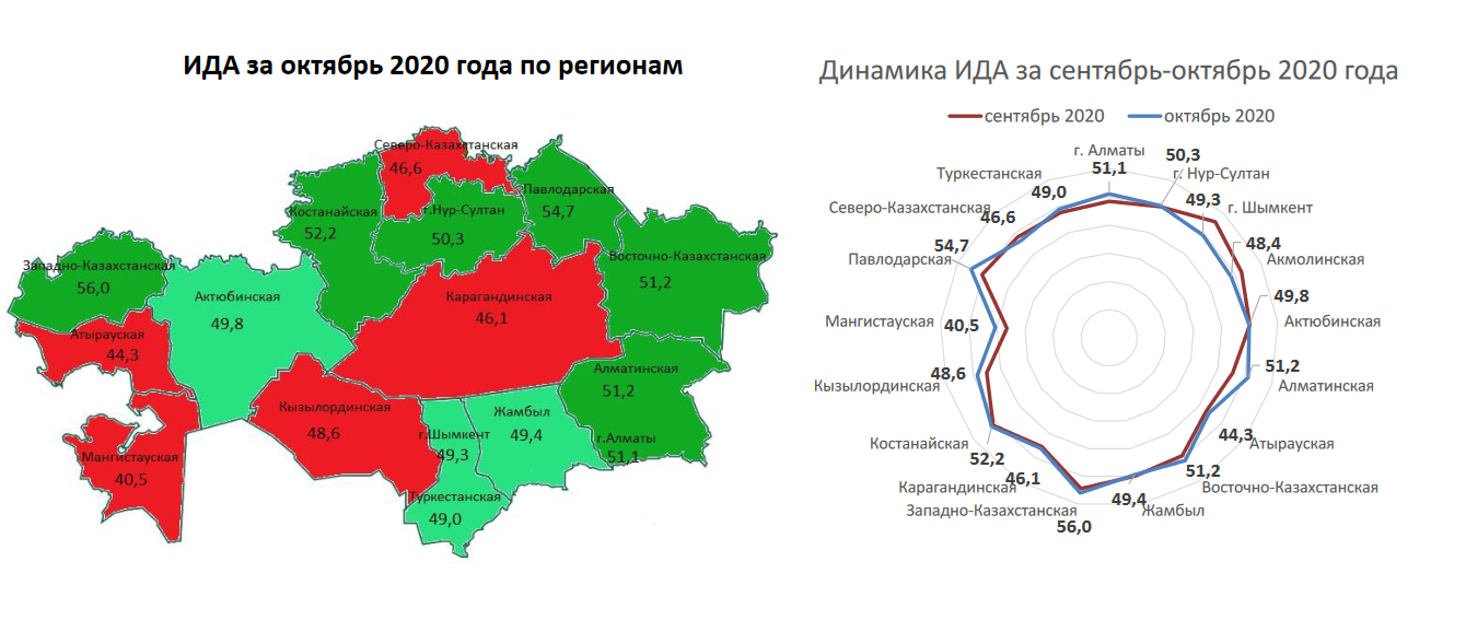 Наиболее высокий показатель в Казахстане демонстрирует Костанайская область – здесь ИДА в октябре составил 57,2 пункта. Здоровый оптимизм и в Западно-Казахстанской области – 56 пунктов.