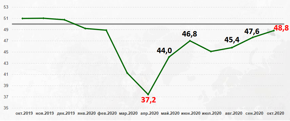 Показатель октября – 48,8 пунктов. Это лучший результат с марта текущего года и на 1,2 пункта больше сентябрьского показателя. А это говорит о том, что восстановление экономики Казахстана продолжается, хотя выйти на «позитивный» уровень все еще не удается.