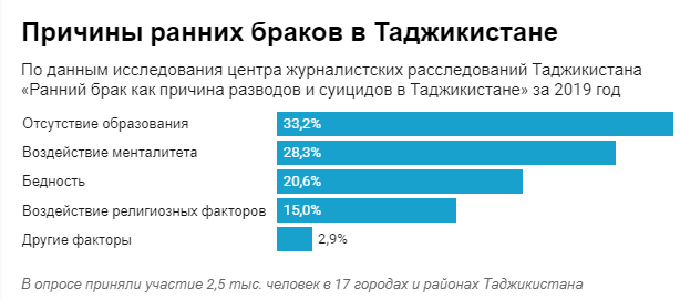 В 2019 году Центр журналистских расследований провел исследование «Ранний брак, как причина разводов и суицидов в Таджикистане» в 17 городах и районах страны, согласно которому воздействие менталитета, отсутствие образования и бедность являются главными факторами ранних браков.