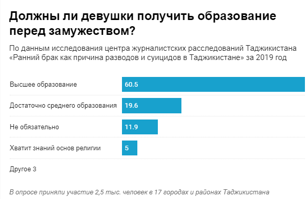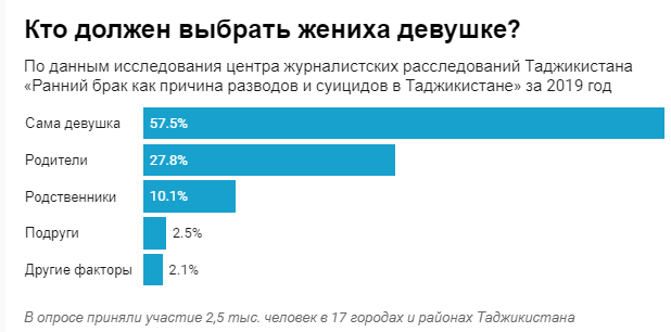 Согласно опросу Центра журналистских расследований, больше половины респондентов считают, что девушка должна выбирать жениха сама, но по факту мнение девушек во время выбора жениха в таджикских семьях не учитывается.