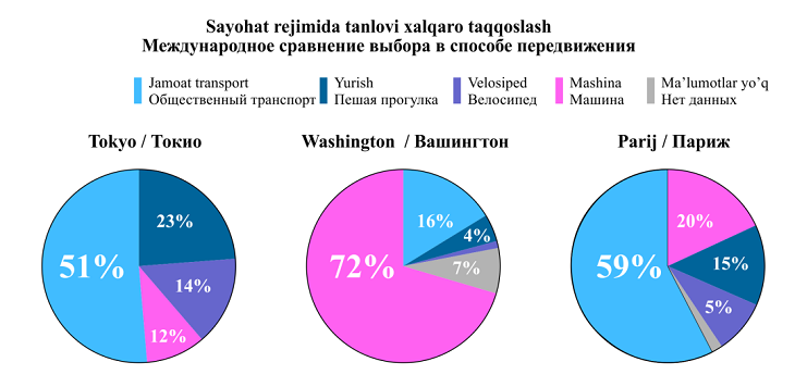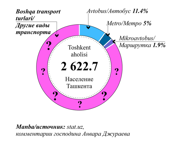 Получается, что только порядка 18% жителей Ташкента ежедневно пользуются общественным транспортом. В то же время неизвестно какое количество населения передвигается на иных видах транспорта (машины, пешком, велосипед, не передвигаются). В связи с этим возникают следующие вопросы: если в городе всего 18% пользователей общественного транспорта, то где нужно строить велодорожки, кто будет их конечным потребителем и насколько эффективны будут программы поощрения пешеходных прогулок при нынешней сомасштабной автомобилям модели города?