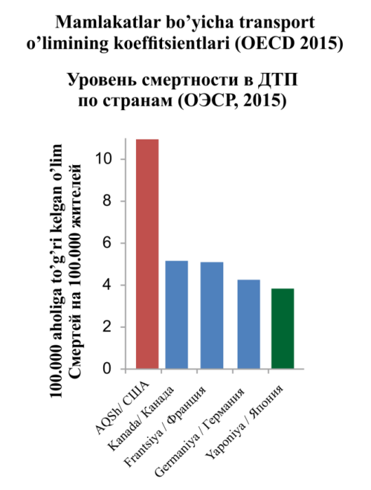 На международном графике смертности от ДТП за 2015 год видно, что наибольшая доля смертности от ДТП происходит в США, где большинство людей передвигаются на машинах. Вдвое меньше смертность в европейских странах, где более половины жителей городов с удовольствием используют общественный транспорт. Однако наименьшие показатели ДТП зафиксированы в Японии.