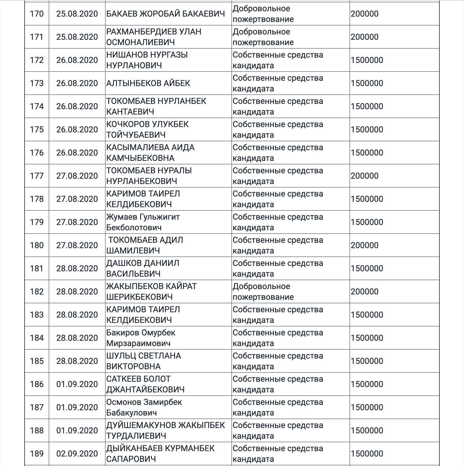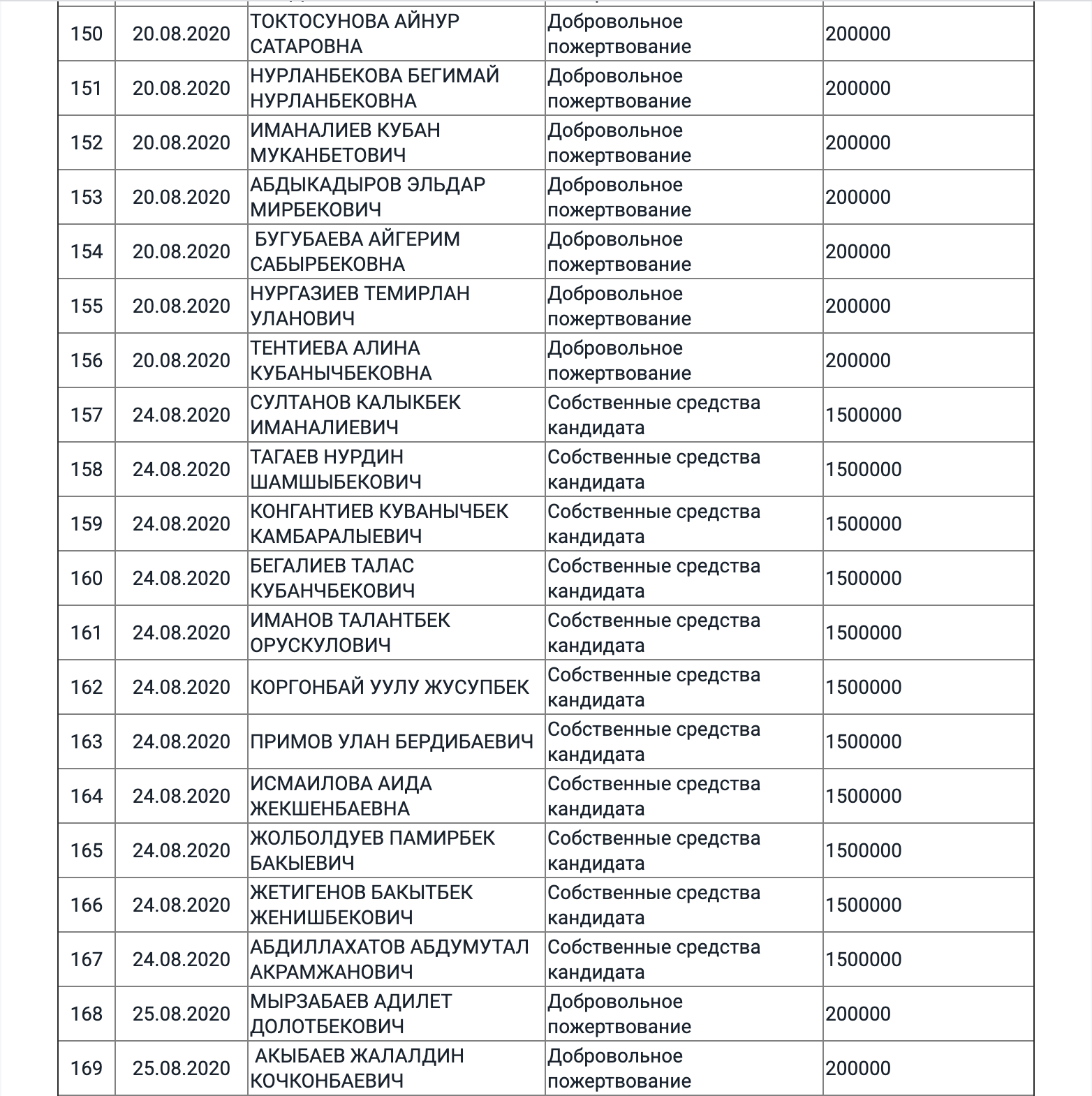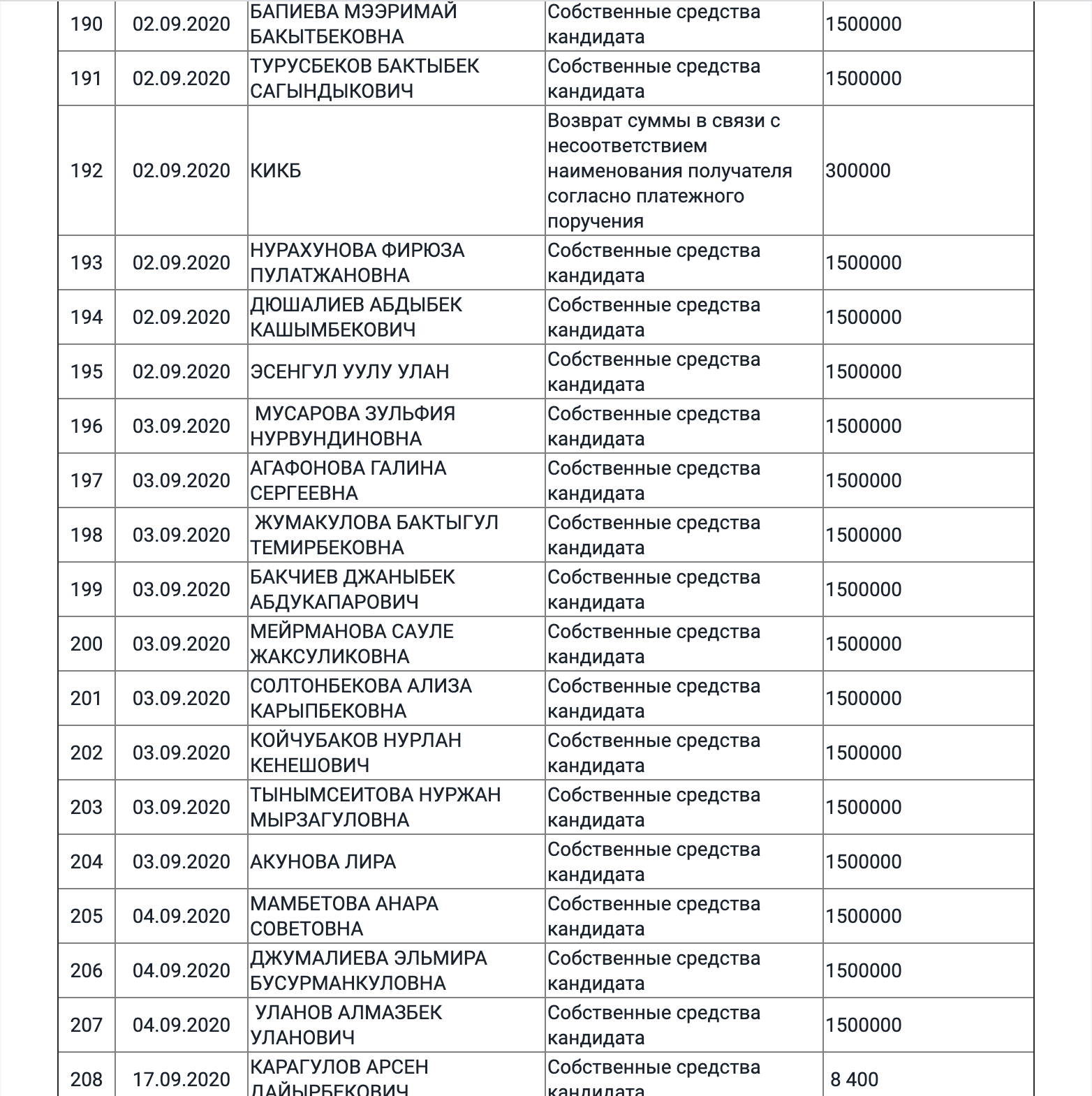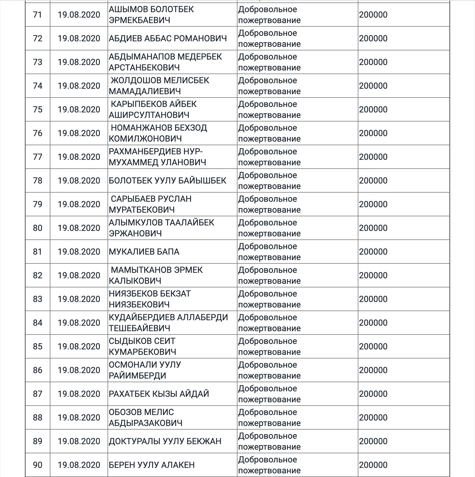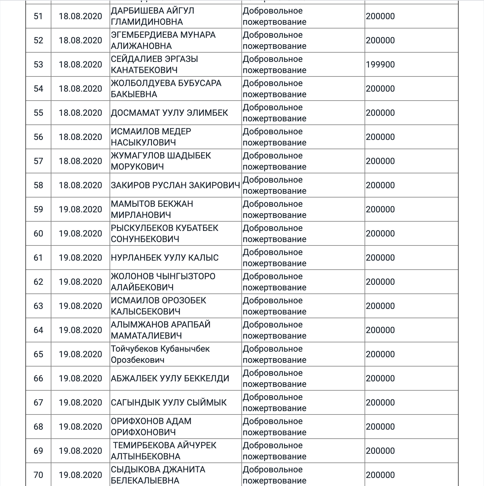 День, о котором рассказывает сотрудник штаба — 19 августа 2020 года. Именно тогда произошел самый большой вброс «добровольных» денег на счет «Биримдик» — 66 человек пожертвовали по 200 тысяч сомов каждый. Итого 13.2 млн сомов только в этот один день поступило на счет партии.