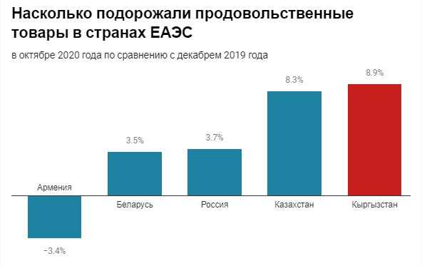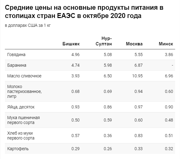 Зато покупательская способность в столицах ЕАЭС отличается существенно. На среднюю зарплату в Бишкеке можно купить в два-три раза меньше продуктов. Выходит, что при самых дешевых продуктах пропитание в Бишкеке (с бишкекской зарплатой) обходится дороже, чем в остальных столицах.
