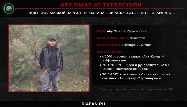 В середине 2015 года руководство сирийским отделением ИПТ принял один из самых опытных командиров Абу Омар ат-Туркестани. Уроженец китайского Синьцзяна до 2001 года бежал в Афганистан, где примкнул к «Аль-Каиде». Участвовал в боях против американцев за укрепрайон Тора-Бора, а затем перебрался в Пакистан, где был задержан Межведомственной разведкой и до 2011 года просидел в тюрьме. После освобождения вступил в ряды террористической организации «Союз исламского джихада» (СИД), базирующейся в Вазиристане и аффилированной с «Аль-Каидой» и «Талибаном». В многоэтнической группировке Абу Омар быстро приобрел авторитет, так как свободно говорил на нескольких языках, включая английский, пушту и русский. В конце концов он стал одним из командиров СИД, пока в 2015 году не уехал в Сирию.