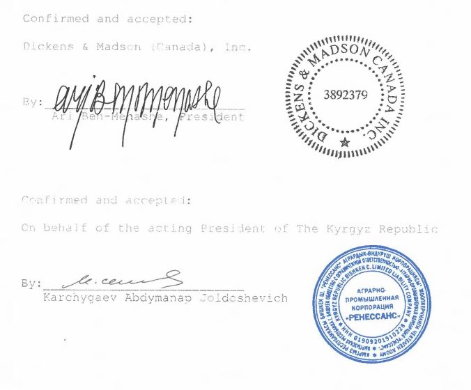 Якобы Ари Бен-Менаше должен организовать встречу Садыра Жапарова с Биньямином Нетаньяху, политическими руководителями Саудовской Аравии и ОАЭ для… получения инвестиций в дорожную инфраструктуру, разработку месторождений и сельское хозяйство. Из документа, опубликованного на сайте регистрации иностранных агентов при Департаменте юстиции США, следует, что консультации фирмы Ари Бен-Менаше обойдутся киргизской стороне в 1 миллион долларов. Половину этой суммы исполнители уже получили. В роли заказчика выступает упомянутый выше А. Карчыгаев, который действует от имени и. о. президента Киргизии С. Жапарова: подпись с Карчыгаева скреплена печатью аграрно-промышленной компании «Ренессанс». Согласно базе данных Минюста Киргизии, «Ренессанс» занимается растениеводством и животноводством.