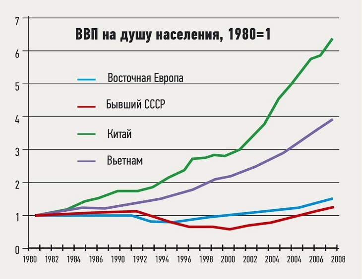 После 80-х годов экономики Китая и Вьетнама продолжали расти, в то время как экономики постсоветских стран потерпели коллапс и стагнацию. Согласно неоклассической теории роста, Китай и Вьетнам, которые применяли двухпутный (постепенный) переход к рынку, должны были потерпеть неудачу, а постсоветские страны, применявшие «шоковую терапию», – J-образный рост. Но этого не произошло.