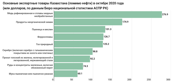 Также в октябре снизились продажи некоторых металлов: цинка, алюминия и титана. Кроме того, Грузия не покупала казахстанский бензин (-3 млн долларов), Афганистан закупки значительно сократил (с 3,8 млн до 0,4 млн долларов). В итоге общий экспорт товара снизился до 9,8 млн долларов.