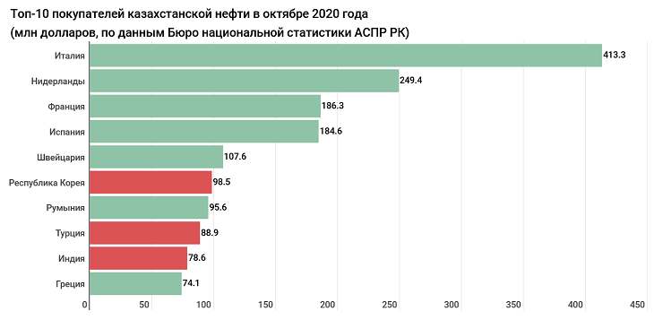 Вновь крайне низкими оказались показатели экспорта нефти в Китай – 4,1 млн долларов против 3 млн в сентябре. Даже Узбекистан покупает больше – 5,3 млн долларов. Значительно просели и продажи в Индию – с 116,1 млн до 78,6 млн долларов. Впрочем, азиатское направление спасают Корея (+55 млн до 98,5 млн долларов) и Турция (+16,8 млн до 88,9 млн).