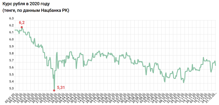 Ситуация с рублем прямо противоположная. Российская валюта в начале года стоила 6,16 тенге, в конце – 5,65 тенге. Таким образом тенге укрепился относительно рубля в 2020 году на 8,3%.