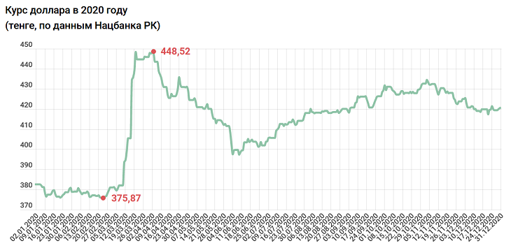 В 2020 год Казахстан входил с курсом доллара в 382 тенге 59 тиын. На протяжение нескольких недель тенге понемногу укреплялся, впрочем, не самыми значительными темпами: к 22 февраля курс опустился до 375,87 тенге. Как оказалось, это был предел – меньше в 2020 году доллар стоить уже не будет.