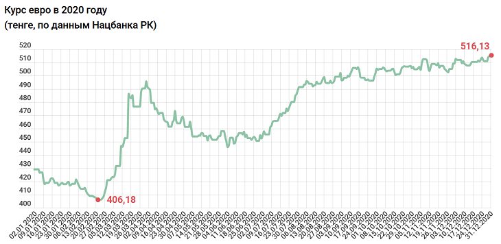 Через 2 месяца покорена и новая планка – 510 тенге. 2020 год закончен на уровне 516,13 тенге – а это рекорд, ведь дорого за европейскую валюты в республике еще не просили.