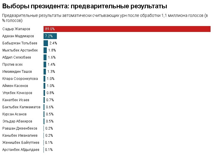 10 января, в Кыргызстане прошли досрочные выборы президента и референдум по форме правления. Право голоса имели более 3,5 миллиона кыргызстанцев. На текущий момент подсчитано 75,17 процента голосов избирателей. Напомним, что это не официальные данные, впереди еще ручной подсчет голосов.