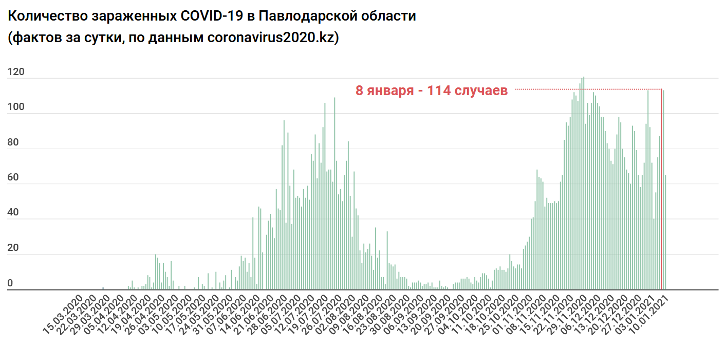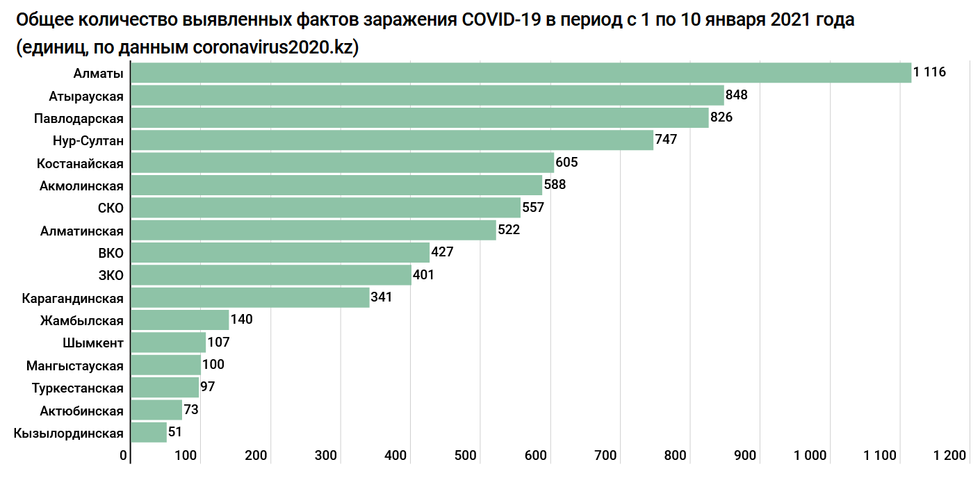 По данным Сайта coronavirus2020.kz, 10 января COVID-19 нашли у 120 жителей Алматы. Это наибольшее число среди всех регионов Казахстана. Причем лидерство южного мегаполиса становится привычным.
