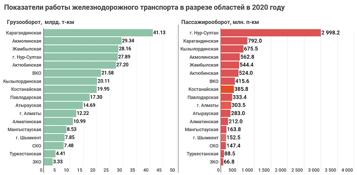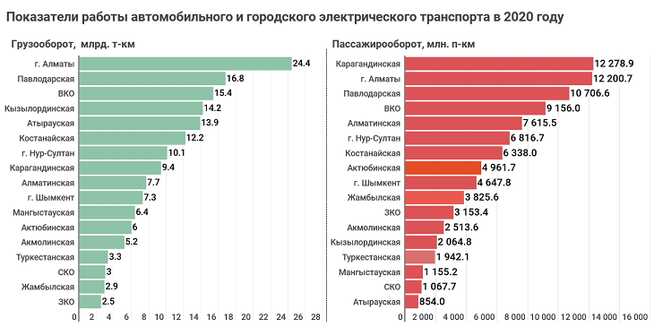 Сильнее всего грузооборот упал в Западно-Казахстанской области – сразу на 46% (до 3,3 млрд т*км – самый низкий показатель в республике). Также упали показатели в Алматинской (-32% до 11 млрд), Мангыстауской (-33,1% до 8,5 млрд) и Туркестанской (-35% до 4,4 млрд) областях.