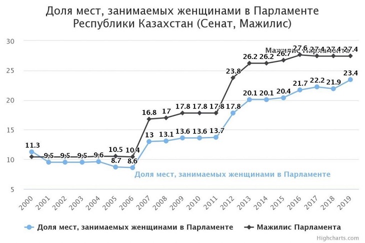 Так, в нижней палате парламента Казахстана представленность женщин, хоть и выросла значительно с начала 2000-х годов, тем не менее, остается на уровне 27,4%.