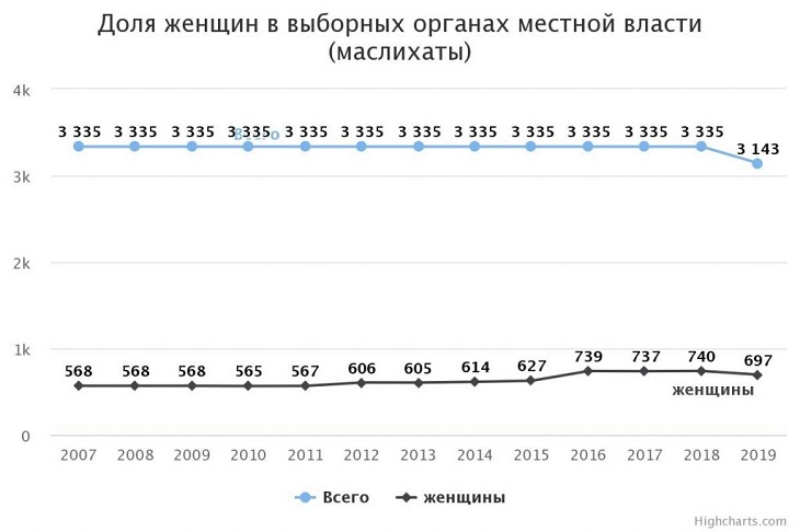 Взглянув на официальную статистику по вовлечению женщин в общественную жизнь и процессы принятия решений, становится ясно, что помимо принятия обширных, но способных удовлетворить международное сообщество мер, Казахстан мало продвинулся в предоставлении женщинам пространства для защиты собственных интересов и продвижения своей повестки в правительстве и представительных органах власти.