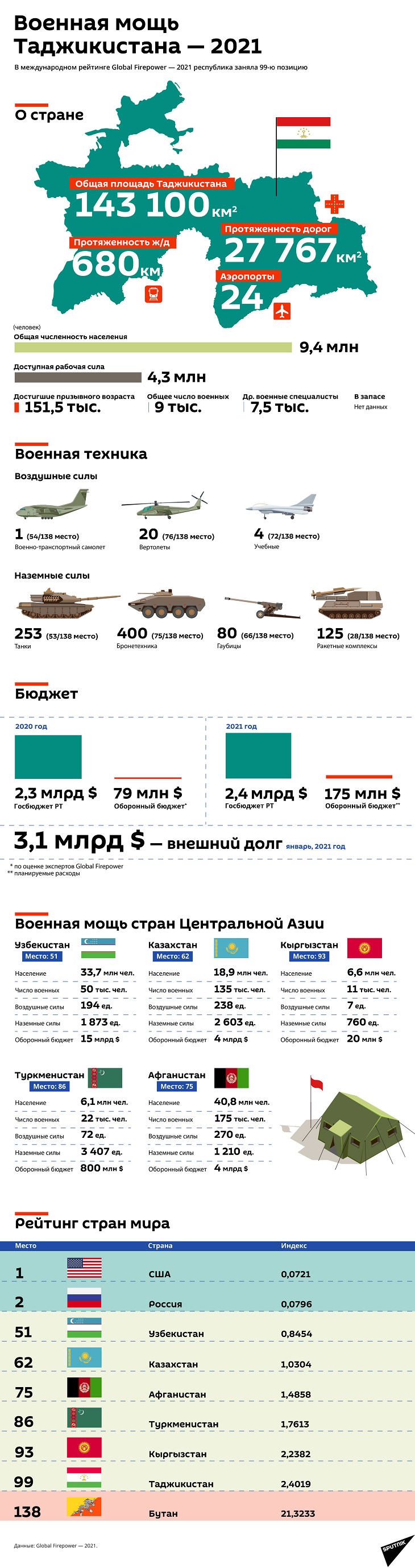 В обновленном международном рейтинге военной мощи Таджикистан занял 99-ю строчку из возможных 138.