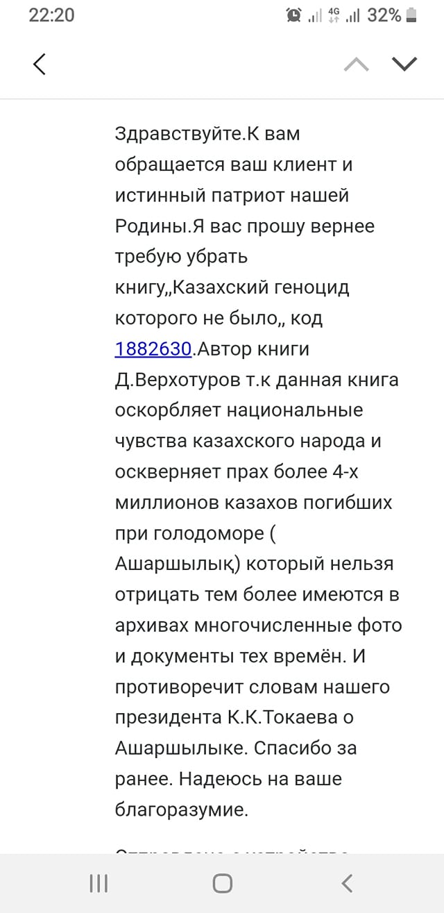 Он сообщил, что книга будет дальше продаваться для читателей в Казахстане через ресурс «Лабиринт», куда по его данным уже поступило несколько заказов из республики.