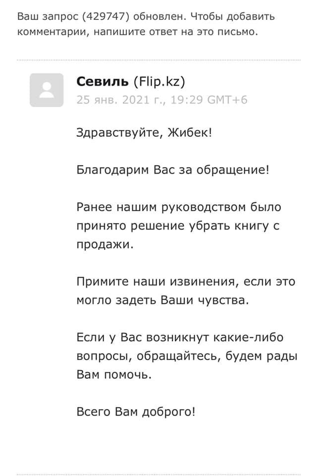 Мы связались с отделом продаж «Флип.кз», где первоначально пытались отрицать факт политического решения об изъятии издания: «В данное время книги нет в продаже у нашего поставщика, по этой причине она у нас отсутствует… Если книга появится в продаже у нашего поставщика, нами будет приниматься решение о реализации книги на нашем сайте».