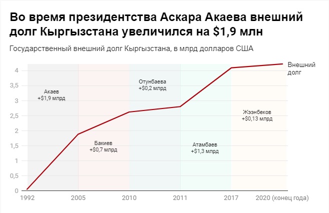 Во время правления Аскара Акаева внешний долг Кыргызстана вырос на $1,9 млрд. При президентстве Алмазбека Атамбаева - на $1,3 млрд, во время президентства Курманбека Бакиева внешний долг вырос на $0,7 млрд. При Сооронбае Жээнбекове внешний долг вырос незначительно - с $4,09 млрд до 4,2 млрд.