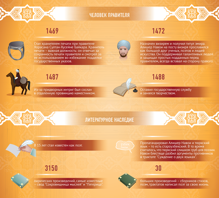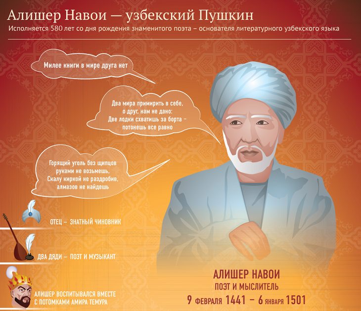 Алишер Навои - фигура мирового масштаба. Это не только поэт, это еще и основатель узбекского литературного языка, в том понимании, в котором мы его воспринимаем сегодня. С этой точки зрения его по праву можно считать узбекским Пушкиным.