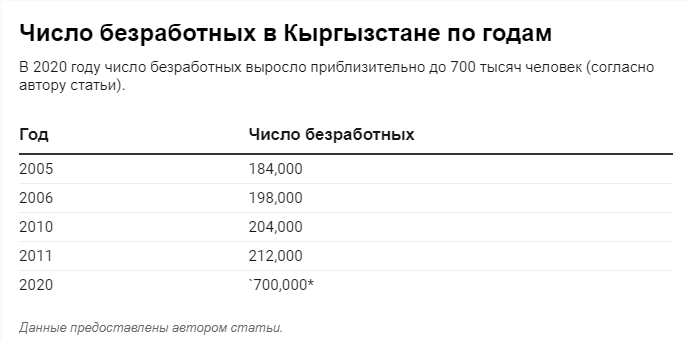 Так в 2005 году, согласно данным национального статистического комитета, безработными числилось 184 тыс. чел., в 2006 – 198 тыс., в 2010 – уже 204 тыс., в 2011 – 212 тыс. человек. В 2019 к неработающим относили 162,7 тыс. (или 6,2% от экономически активного населения страны). Однако после введенного властями весной 2020 года чрезвычайного положения цифра безработных стала достигать приблизительно 700 тыс. человек. Помимо этого, социально-экономическая ситуация стала ухудшаться после возвращения большого количества трудовых мигрантов, оставшихся без работы в других государствах.