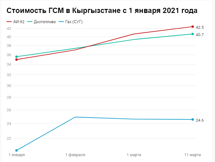 По состоянию на 11 марта, средняя цена бензина марки АИ-92 на АЗС столицы выросла до 42,5 сома. Средняя стоимость дизельного топлива на АЗС составляет 40,7 сома, сжиженного газа (СУГ) — 24,65 сома.