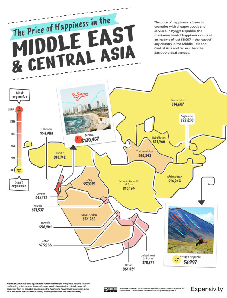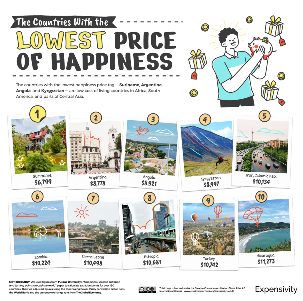 А в Expensivity, используя оценки Университета Пердью посчитали, сколько в год нужно жителям более чем 160 стран для счастья.