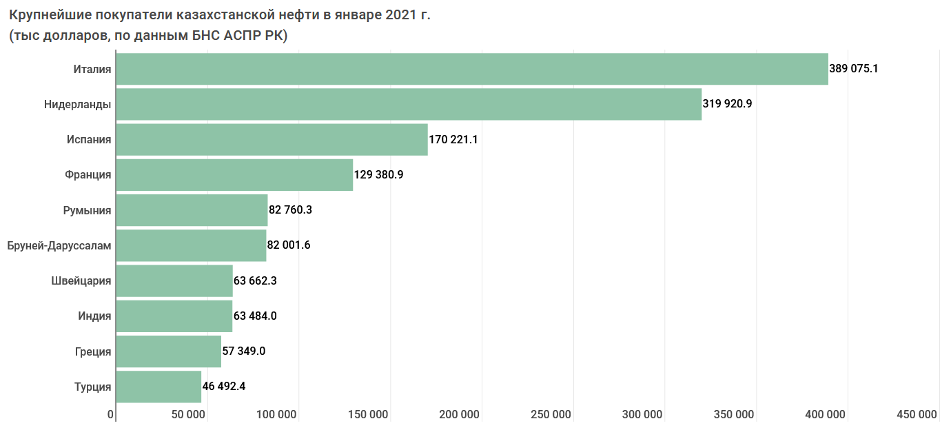 - Первое – почти двукратное падение дохода от продаж в Италию. Если в январе 2020 года крупнейший потребитель казахстанской нефти заплатил за нее $738,5 млн, то год спустя — 389,1 млн