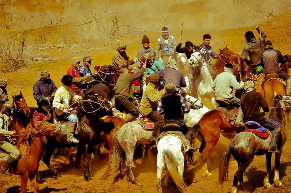 В Узбекистане на Навруз проходят народные гуляния, например, игра Копкари, бои и конные скачки.
