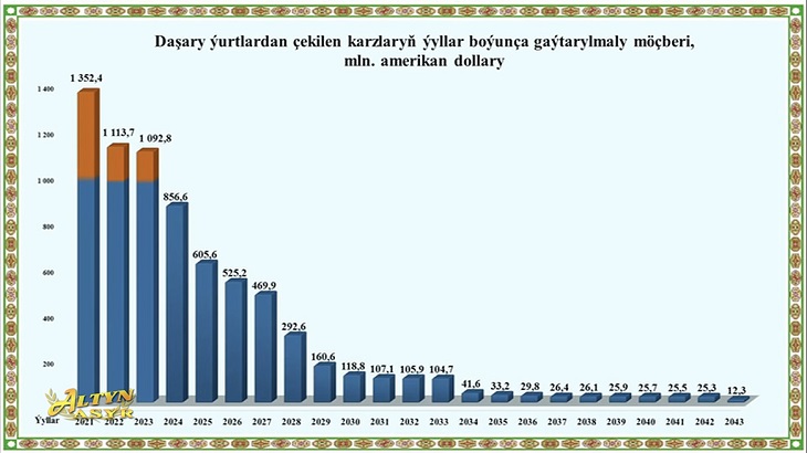 На приведенном выше графике видно, что в 2021 году Туркменистан должен выплатить 1,35 млрд. долларов, а в 2022 и 2023 годах – по 1,1 млрд. долларов.