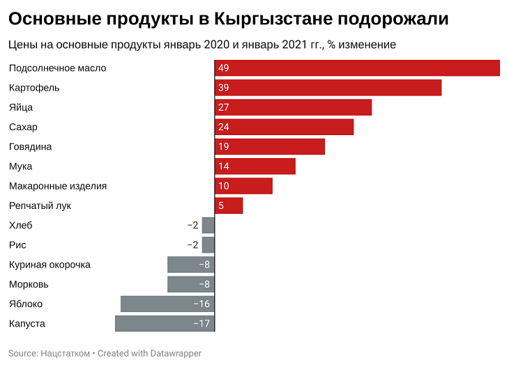 Действительно цена говядины в январе 2020 года в сравнении с прошлым годом того же месяца поднялась на 64 сома. Цена подсолнечного масла выросла на 45 сома, сахар на 10 сомов, яйца на 20 сомов.