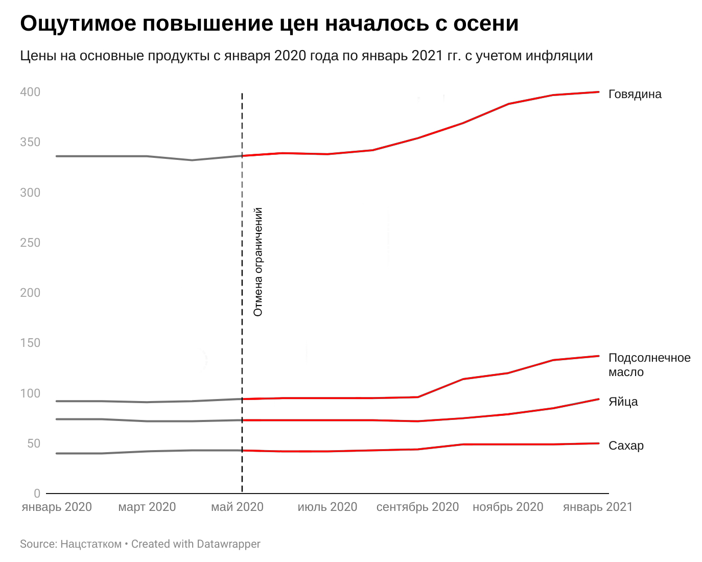 После того как сняли жесткий карантинный режим, основные продукты начали дорожать. Например, лимон и чеснок, которые якобы помогают не заболеть коронавирусом, начали резко дорожать в апреле, а говядина в августе. В сентябре начали расти цены на яйцо, подсолнечное масло и сахар.