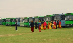 Между тем школьных учителей столицы Ашхабада вынуждают присутствовать на мероприятиях в честь праздника Новруз. На видео, отправленного корреспондентом Азатлыка, можно видеть десятки женщин, которые едут в автобусах в национальных костюмах. Корреспондент сообщает, что их везут на мероприятия в честь праздника Новруза.