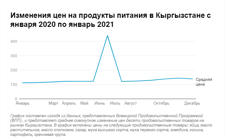 В Кыргызстане наибольший скачок цен на продовольственные товары наблюдался с начала июня по конец июля 2020 года. Учитывая то, что именно в этот период в стране было зафиксировано наибольшее количество заражённых коронавирусом (только за июль число заражённых увеличилось в четыре раза), были введены ограничительные меры на передвижение и люди начали закупаться основными продуктами питания, можно предположить, что именно увеличение спроса вызвало резкий скачок цен.