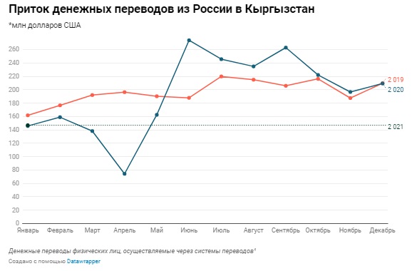 В январе 2021 года приток денежных средств из России в Кыргызстан достиг $146,9 млн, что на $62,4 млн меньше чем в декабре 2020 года. Такой вывод можно сделать, проанализировав данные Национального банка КР.
