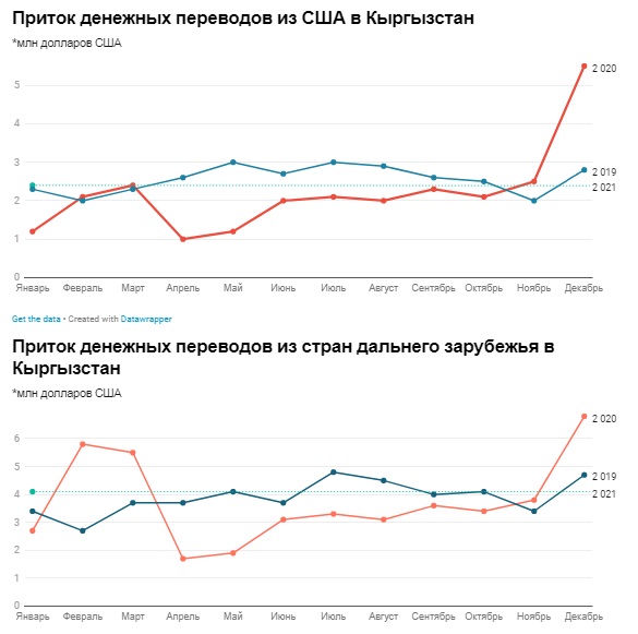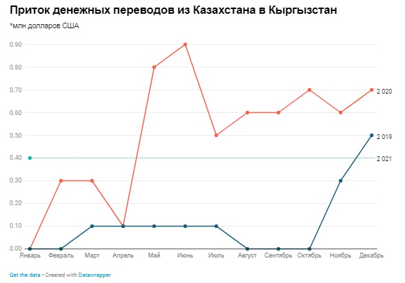 В январе 2021 года из Казахстана в КР перевели $0,4 млн, что на $0,3 млн меньше, чем в декабре 2020 года. Из стран дальнего зарубежья в Кыргызстан в январе того же года перевели $4,1 млн, из США – $2,4 млн.
