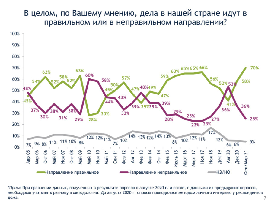 70% опрошенных в феврале считали, что страна движется в правильном направлении, при этом обратного мнения придерживались лишь 25% опрошенных.