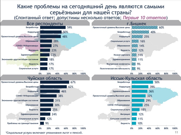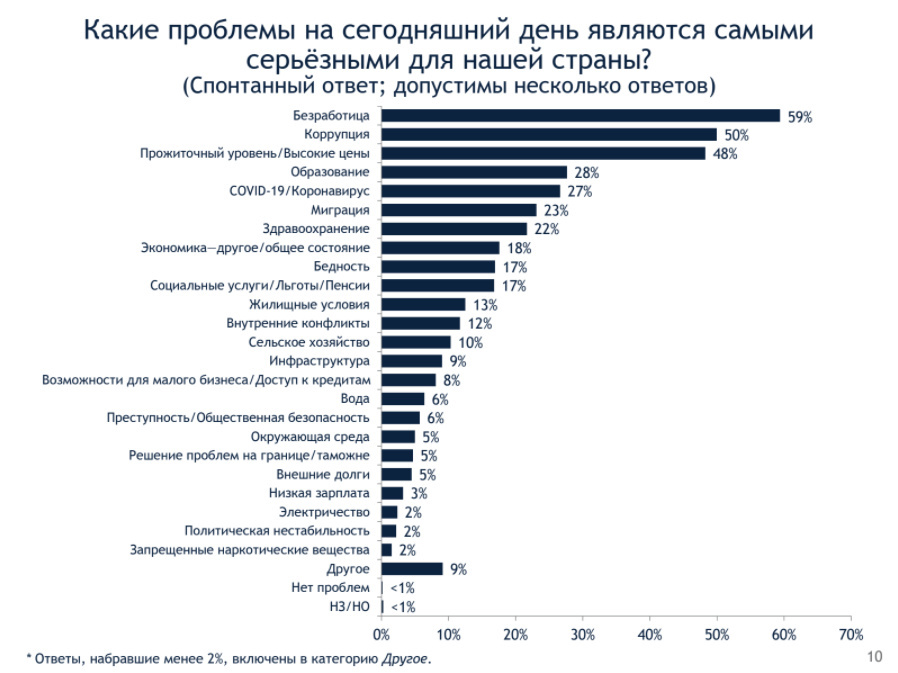 Респонденты перечислили проблемы, которые находят самыми серьезными в стране на сегодняшний день. Это безработица, коррупция, высокие цены, качество образования, миграция, состояние здравоохранения, экономики, низкий доход граждан, социальные услуги и льготы, отсутствие воды, жилищные условия и другие. Как следует из результатов опроса, события, связанные с политикой, граждан особо не волнуют.