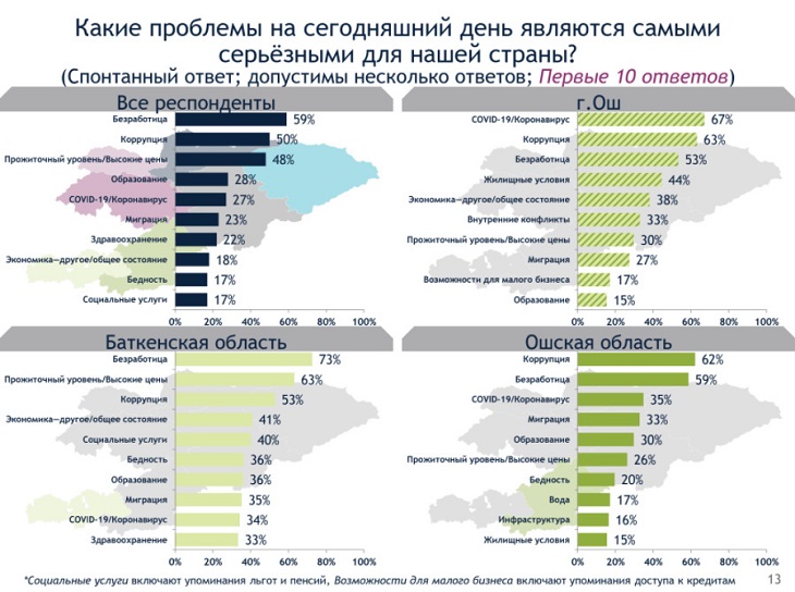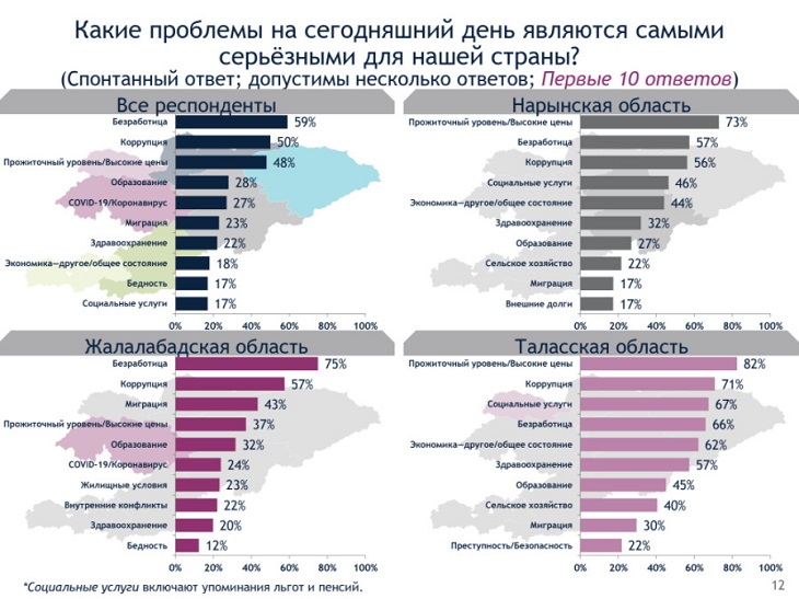 На этот раз в выборке по регионам показатели довольно схожи: у большинства регионов на первом месте стоят проблема безработицы, коррупция и высокие цены на продукты.